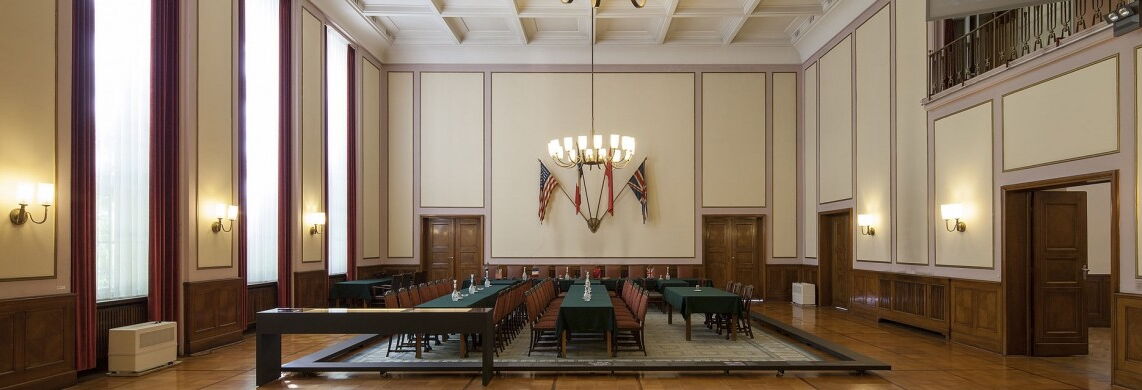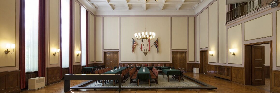 Fig. above: German-Russian Museum Berlin- Karlshorst, main hall of the Officers' Casino of the Wehrmacht School for Pioneers. Here, on 8 May 1945, the High Command of the German Wehrmacht signed the document of unconditional surrender in the presence of the representatives of the four Allied powers. Source: German-Russian Museum