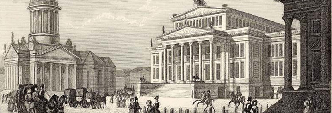 Fig. above: The New Church and Schauspielhaus in Berlin on a steel engraving by H. Fincke based on a drawing by W. Loeillot, published by F. Sala & Co. in Berlin (detail). Source: Gernot Ernst, Ute Laur-Ernst: Die Stadt Berlin in der Druckgrafik 1570–1870. Berlin: Lukas-Verlag 2009