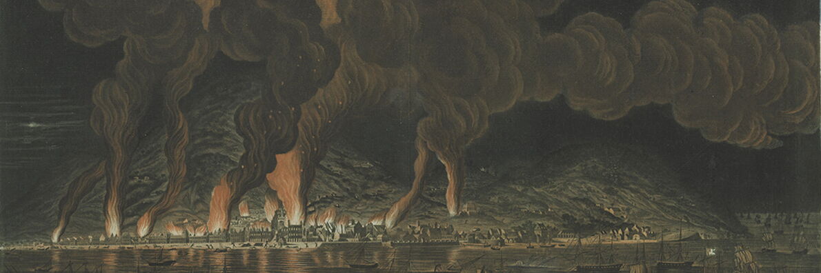 Abb. oben: J.-B. Chapuy: Ansicht des Brands von Cap Français, 21. Juni 1793 (Ausschnitt), ca. 1795