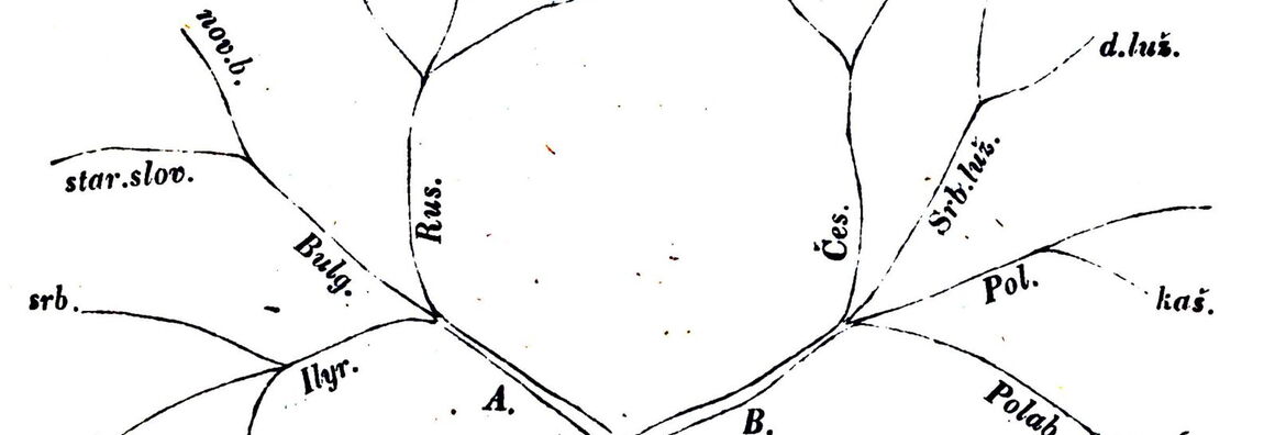 Abb. oben: Stammbaum der slawischen Sprachen und Dialekte, in: František Ladislav Čelakovský: Čteni o srovnavaci mluvnici slovanské na Universitě pražské [Vorlesung über die vergleichende slawische Grammatik an der Prager Universität]. Praha: Rivnáč 1853, 3, Quelle: Bayerische Staatsbibliothek